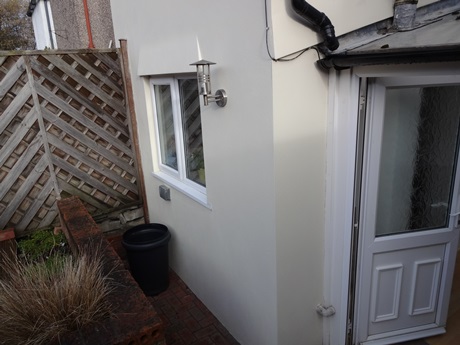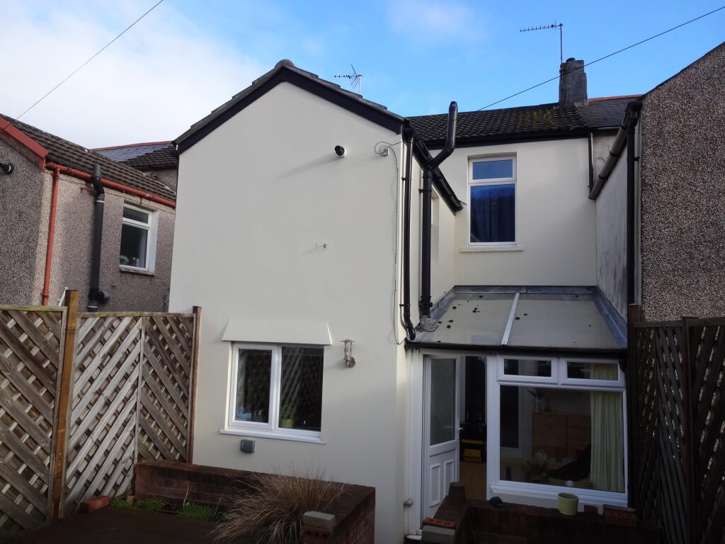 We totally hacked off all old render to all 4 elevations to the rear of this terraced property, prepared all stone work, and then gave it a 2 coat render system, giving it a fine down finish (smooth) as we also offer a painting and decorating service, we also carried out the painting of the back and the front of this terraced home. What a wonderful result. Looks like a different house.
